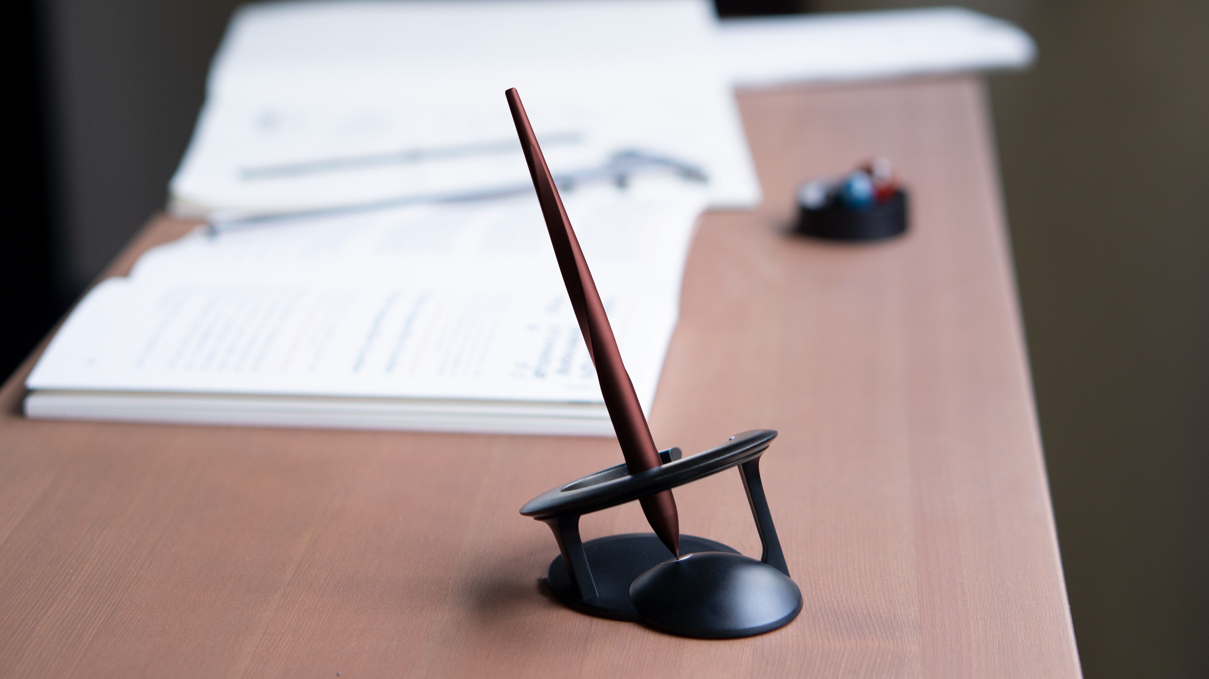 Thanks to the very precise fabrication of the pedestal, the Hoverpen sits in a ring of magnetic repulsion. Balanced at an angle of 23.5°, the pen itself is designed to oppose gravity.