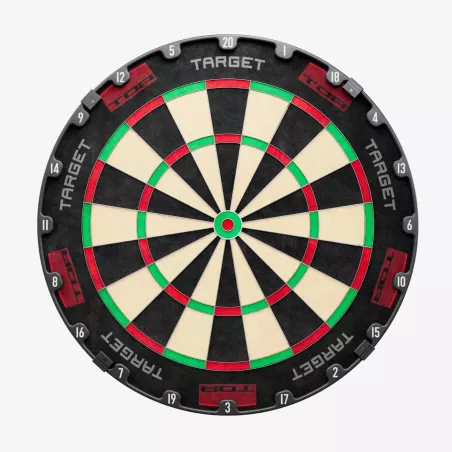 Cible haut de gamme avec cerclage rotatif, fils ultra-fins et bullseye sans agrafes. Silencieuse et durable, elle convient aux joueurs débutants comme confirmés.